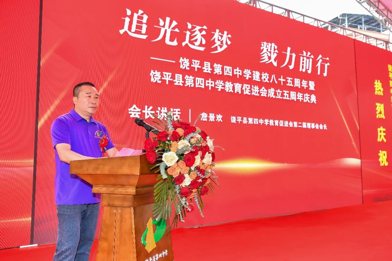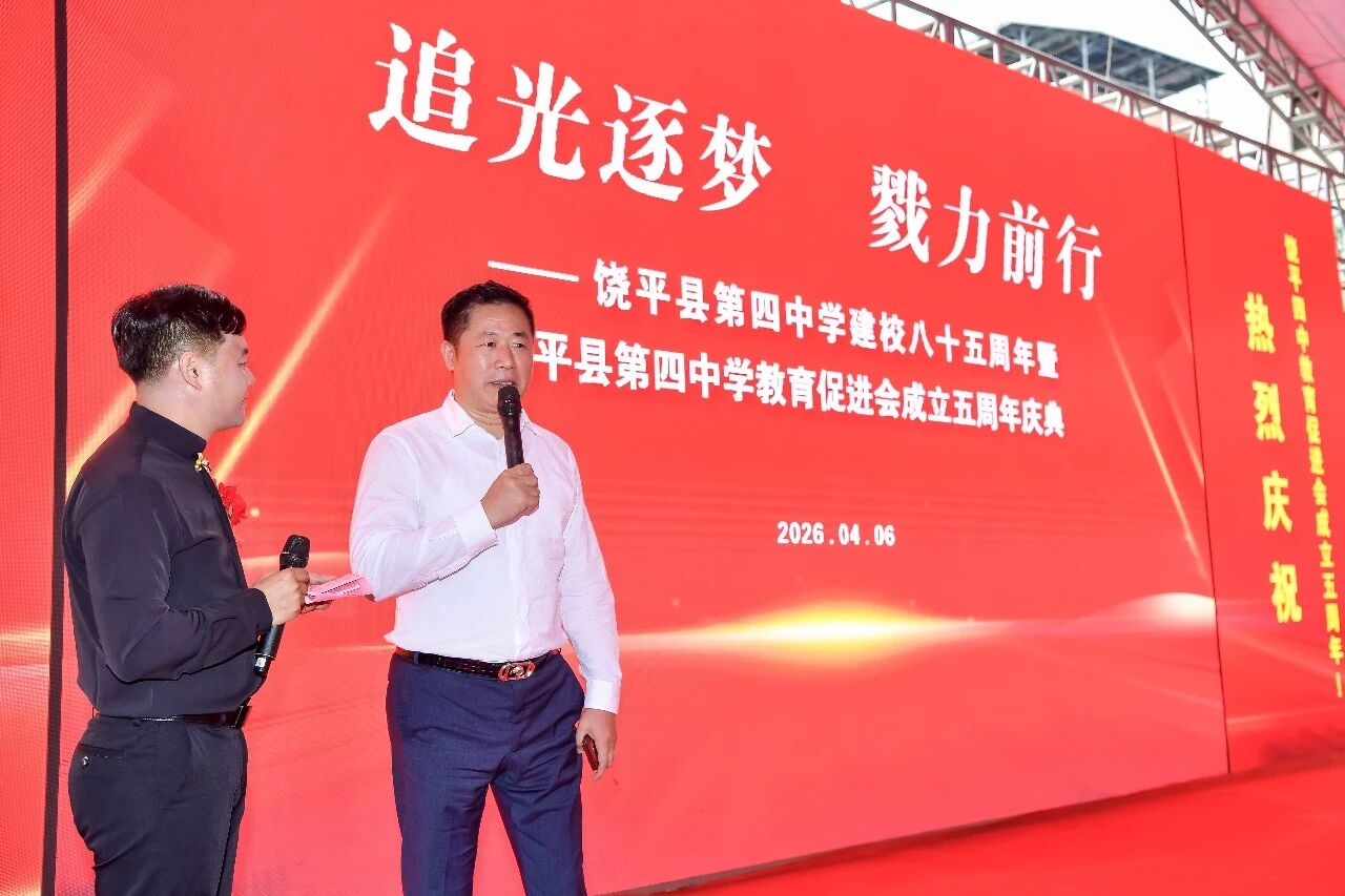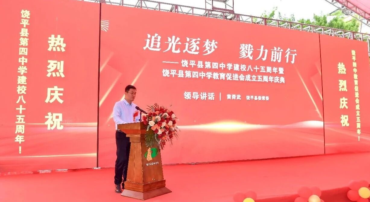 近年来,饶平县坚持教育优先,先后投入超15亿元,推动建成了四中综合楼、学生宿舍楼及食堂综合楼等62个教育重点项目。四中作为饶北教育的标杆学校,要以建校85周年为新起点,坚守立德树人根本任务,深化教研教改,争做山区优质教育的排头兵。教育促进会要当好桥梁纽带,凝聚校友力量,让兴教助学蔚然成风。他希望各位嘉宾、各界朋友一如既往关心、支持饶平教育事业发展,为推进饶平教育现代化作出新的贡献。