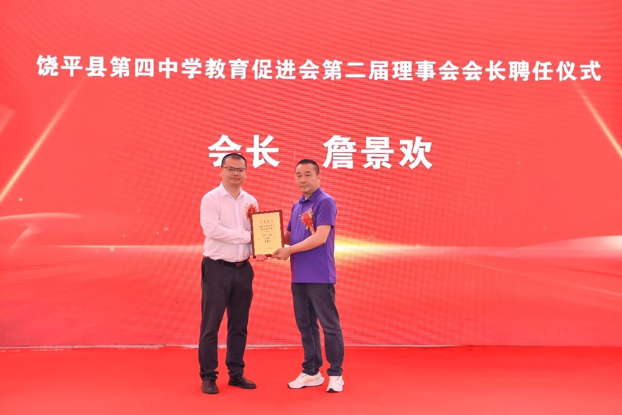 活动中还举行了饶平四中教育促进会第二届理事会成员聘任仪式和捐赠仪式,詹景欢连任会长,饶平县教育局局长曾岳鹏为其颁发牌匾。