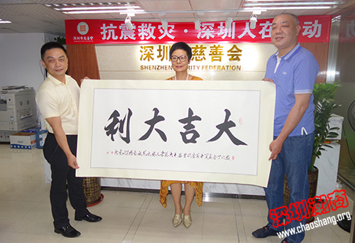 陈健辉名誉会长、深圳市潮汕文化研究会常务副会长倪壁雄向深圳市慈善会赠送“大吉大利”书法题字