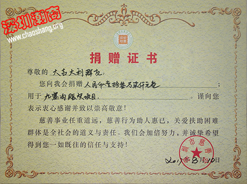 深圳市慈善会为大吉大利群友颁发捐赠证书