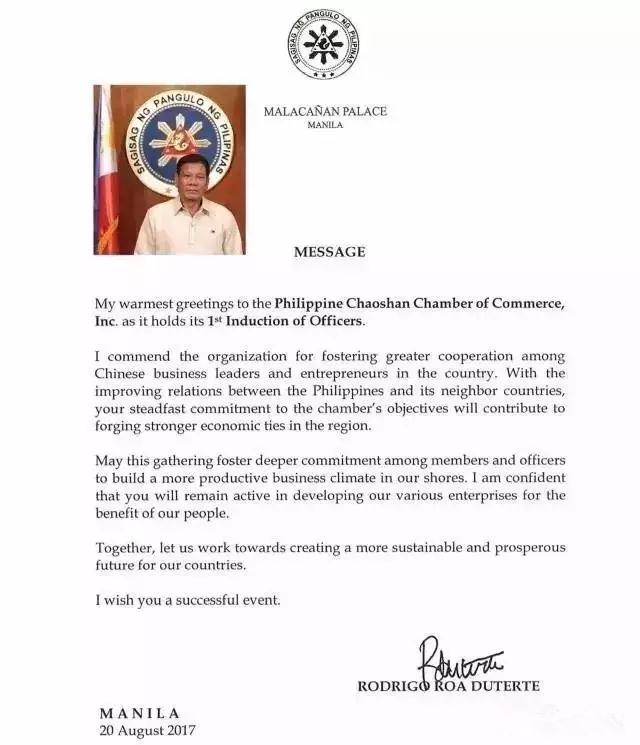 菲律宾总统杜特尔特先生向菲律宾潮汕总商会发来贺信