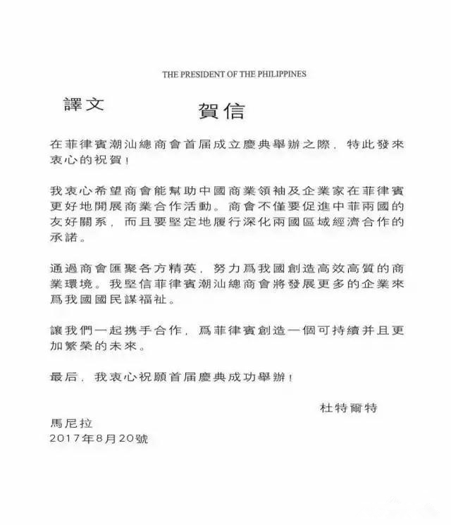 菲律宾总统杜特尔特先生特意向菲律宾潮汕总商会发来了贺信,以示祝贺。