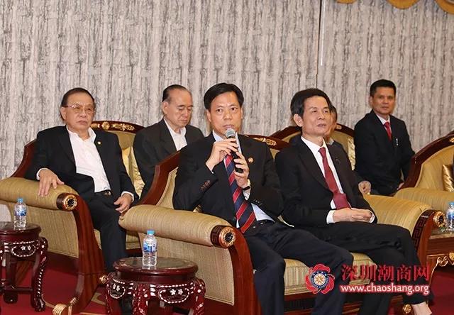 黄迨光主席简要介绍了泰国潮人和潮州会馆的概况和影响力。 他介绍,泰国约有700万潮人,是推动泰国经济社会发展的一支重要力量,泰国潮州会馆因此也受到泰国政府的格外重视。中国的日益强大,令海外华人倍感骄傲自豪。 “一带一路”倡议提出几年来已取得了丰硕的成果,相信凭借海内外潮商的影响力,在不久的将来,潮商东盟一带一路投资基金也一定会取得成功。
