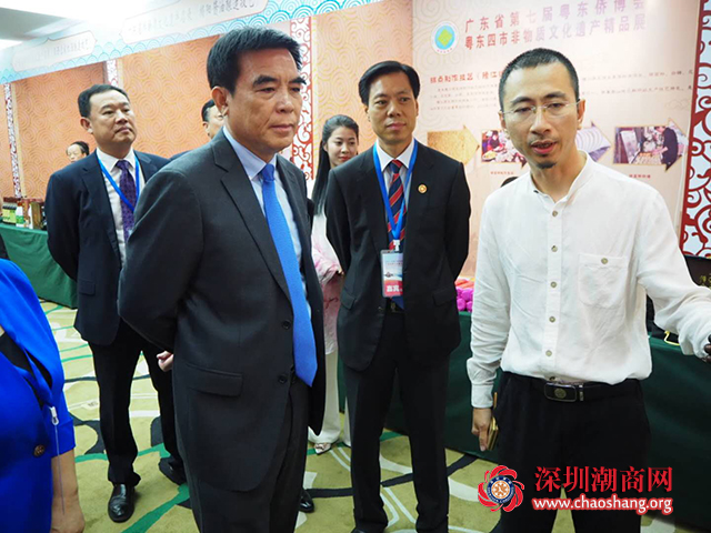 汕尾市委书记石奇珠(左一)与吴木棠会长(中)一同参观粤东四市非物质文化遗产精品展