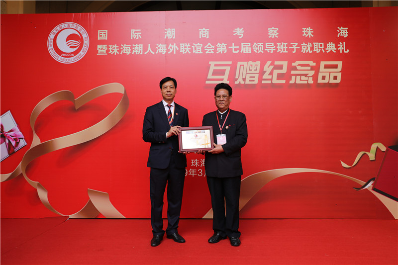我会会长吴木棠代表商会向珠海潮联会赠送纪念品