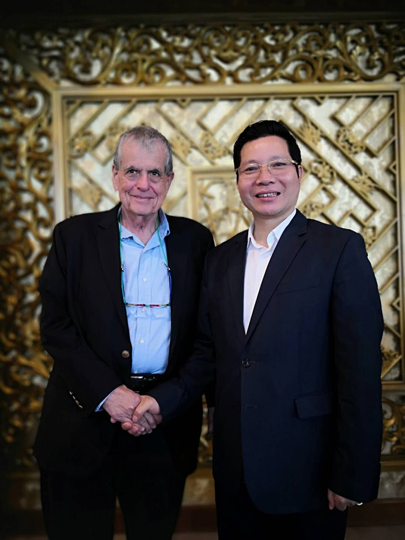 2012年11月14日,第五届潮商大会在深圳南山区保利大剧院隆重召开。全国政协副主席、民革中央常务副主席厉无畏(左)与泰国华人青年商会会长李桂雄(中),我会常务副会长周南(右)亲切交谈