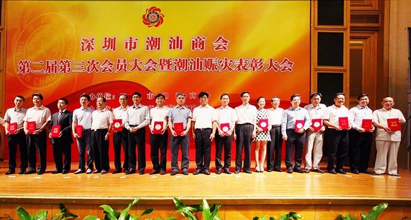 2013年9月14日,在深圳市潮汕商会第二届第三次会员大会暨潮汕赈灾表彰大会上,周南常务副会长(右五)荣获“赈灾特别贡献奖”称号
