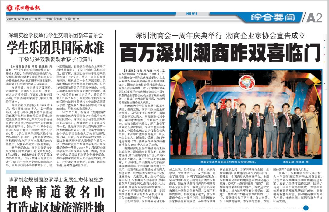 2007年12月23日,是百万深圳潮商“双喜临门”的好日子。深圳潮商会一周年庆典隆重举行,在来自海内外1000多位潮商代表的共同见证下,潮商企业家协会同时宣告成立。市人大常委会常务副主任庄礼祥对深圳潮商会成立一周年及潮商企业家协会的成立表示热烈的祝贺,并冀望广大潮商再接再厉,为深圳的发展作出新的更大贡献。