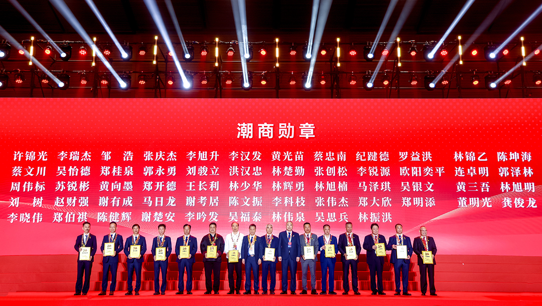 深圳市潮汕商会驻会会长黄育宏、监事长许建洲为受表彰者颁发潮商勋章
