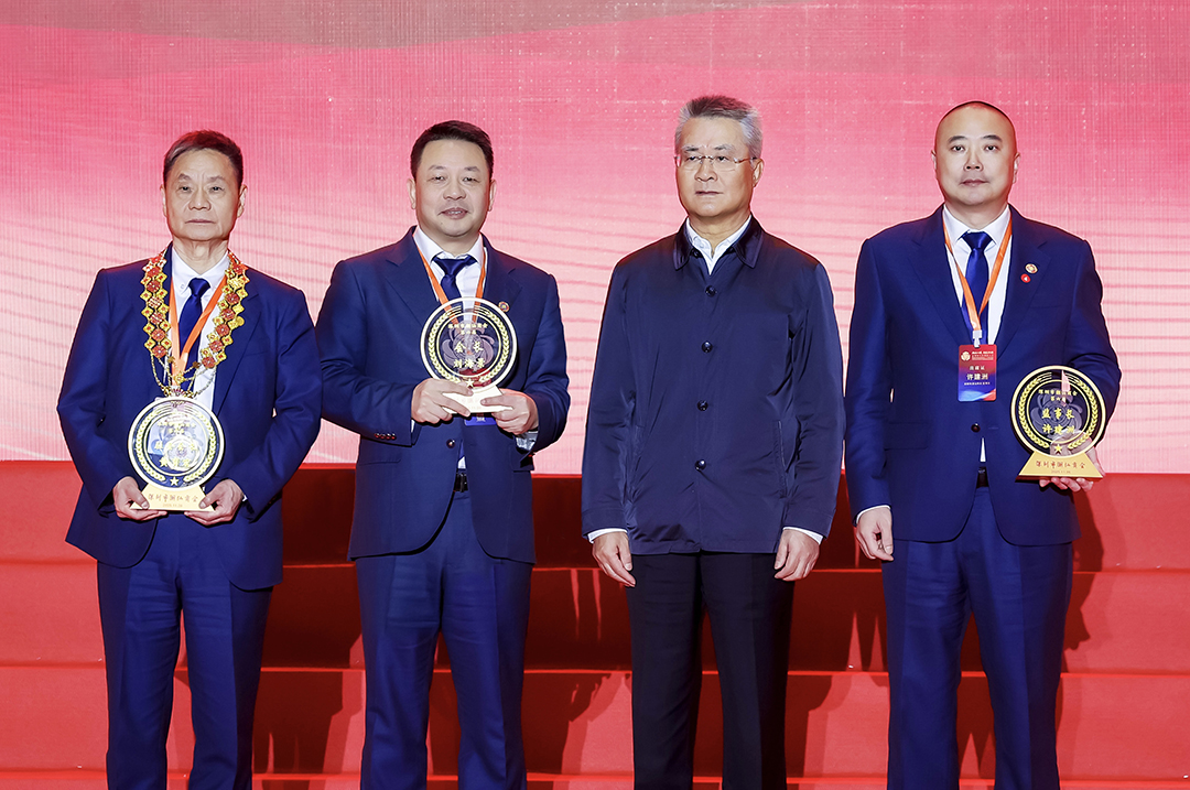 全国政协港澳台侨委员会原副主任黄兰发(右二)为会长刘海景、驻会会长黄育宏、监事长许建洲颁牌