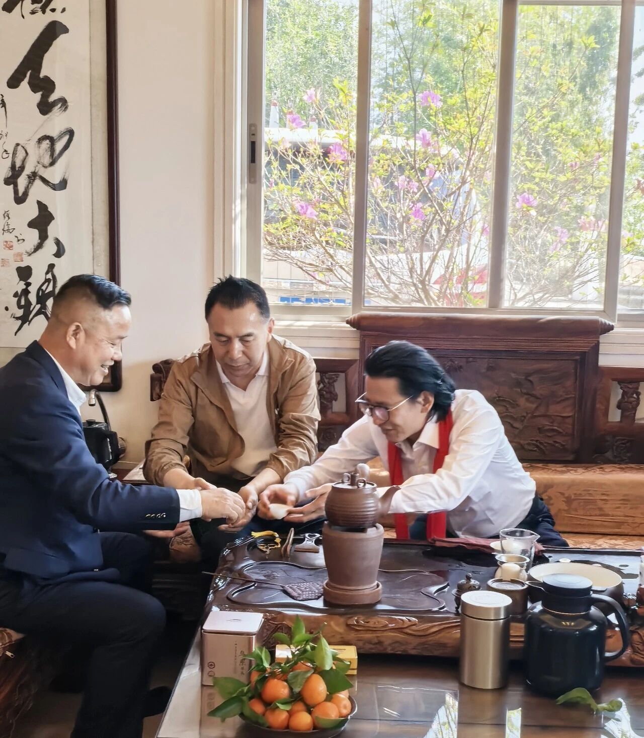 我会常务副会长马日龙(左)与常务副会长谢有成(右)、中国嘉德国际拍卖有限公司佳酿臻茗部总经理于大明(中)品茗交流
