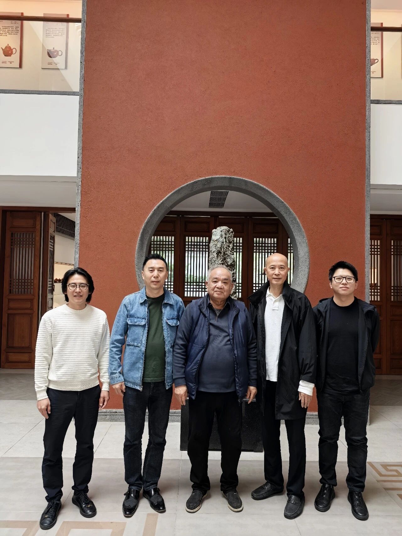 潮州市潮州工夫茶文化研究会会长谢鸿洲(中),国家级非物质文化遗产潮州手拉朱泥壶代表性传承人谢华(右二),深圳市潮汕商会常务副会长谢有成(左一),中国嘉德国际拍卖有限公司佳酿臻茗部总经理于大明(左二),深圳市潮汕商会理事林伟龙(右一)合影