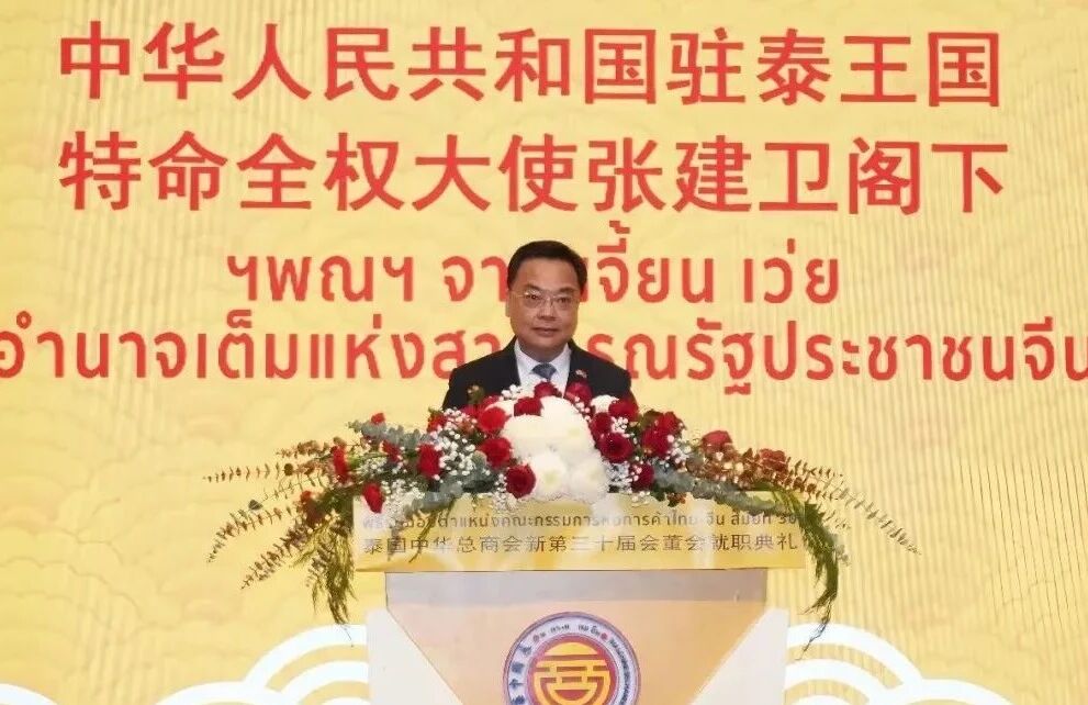 中华人民共和国驻泰王国特命全权大使张建卫在就职典礼上致贺词。他表示,泰国中华总商会作为泰华社会主要的龙头社团,有着光荣传统和辉煌历史,树立了泰华社团的典范,在助力泰国经济发展和社会公益事业、促进中泰友好和民心相通等方面作出了重要贡献。张建卫大使说:“中泰建交50周年是两国友谊继往开来的新起点。希望在林楚钦主席的带领下,泰国中华总商会继续为中泰民众谋福祉,为中泰命运共同体建设做贡献,为中泰友谊万古长青添光彩。”