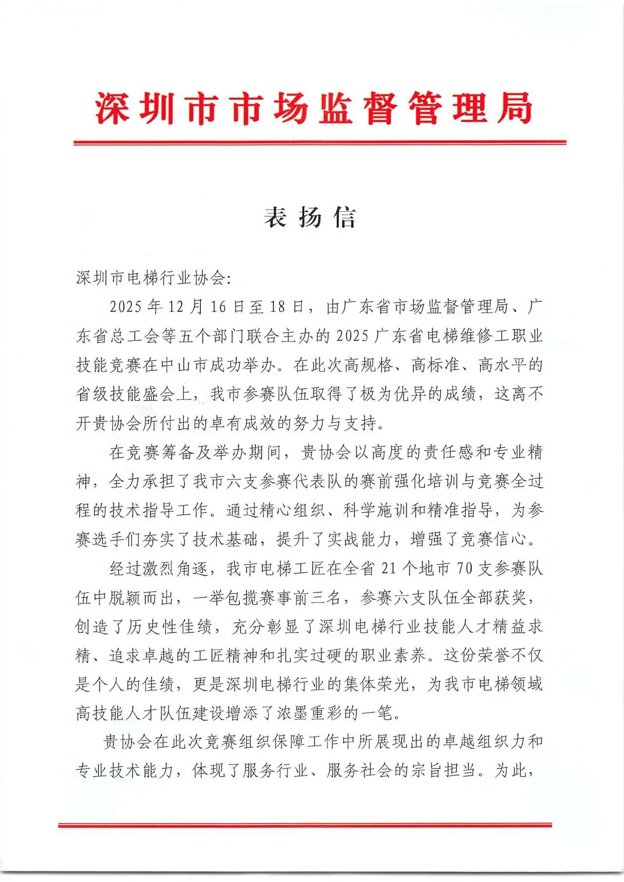 喜讯传佳音,荣耀励前行!近日,我会常务副会长郭泽林领导下的深圳市电梯行业协会喜获深圳市市场监督管理局发来的《表扬信》,对该协会在全力组织深圳市六支代表队参加“2025年广东省电梯维修工职业技能竞赛”中取得的优异成绩和作出的突出贡献予以充分肯定和高度赞扬!