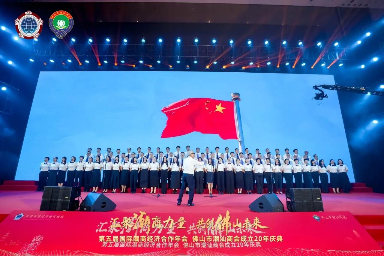 晚上6时,第五届国际潮商经济合作年会暨佛山市潮汕商会成立20 周年庆典拉开帷幕。开场潮州大锣鼓《滨海龙腾》气势恢宏,震撼全场;随后的开场激光秀传递出 “汇聚潮商力量、共创佛山未来” 的时代强音。在庄严的中华人民共和国国歌声中,庆典正式进入主议程。