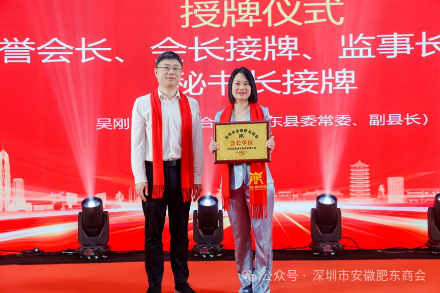 肥东县委常委、副县长吴刚(左)为当选的会长黄玲(右)授牌