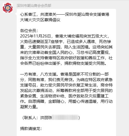 11月27日晚,深圳市潮汕商会会长刘海景、驻会会长黄育宏、监事长许建洲得知香港大埔宏福苑发生五级火灾的严重灾情后,第一时间召开电话会议,并迅速达成共识,决定发起支援行动,向受灾同胞伸出援手。28日,商会通过微信群发布《心系香江,共渡难关 —— 深圳市潮汕商会支援香港大埔火灾灾区募捐倡议》,明确善款将全额用于受灾居民紧急安置、生活物资补给、医疗救助及灾后重建等关键环节。