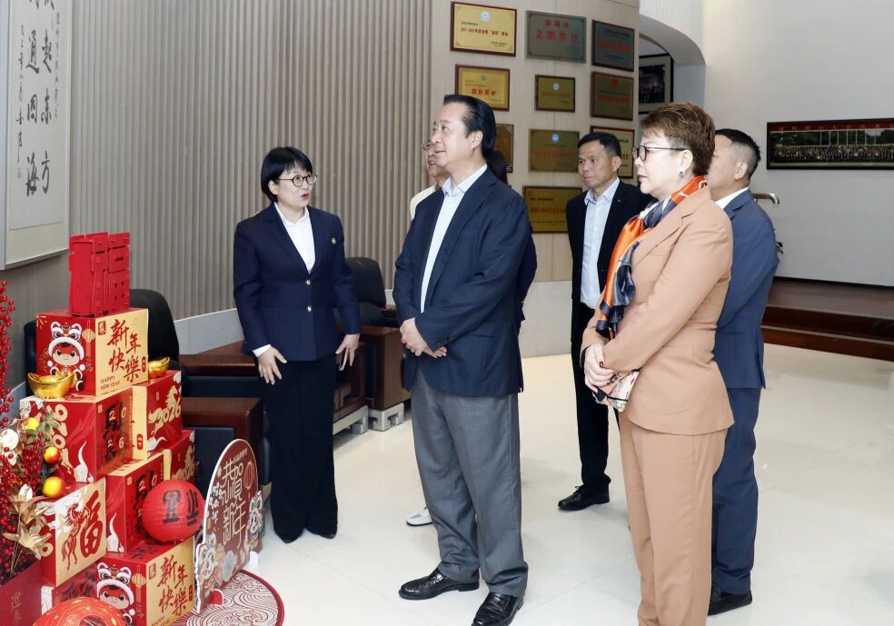 在参观环节中,邓振龙会长一行来到我会的文化展示区、党建墙等区域,了解我会在凝聚潮商力量、服务会员企业、推动经贸合作及投身公益事业等方面的成果,并对商会的规范化运作、品牌影响力给予高度评价。